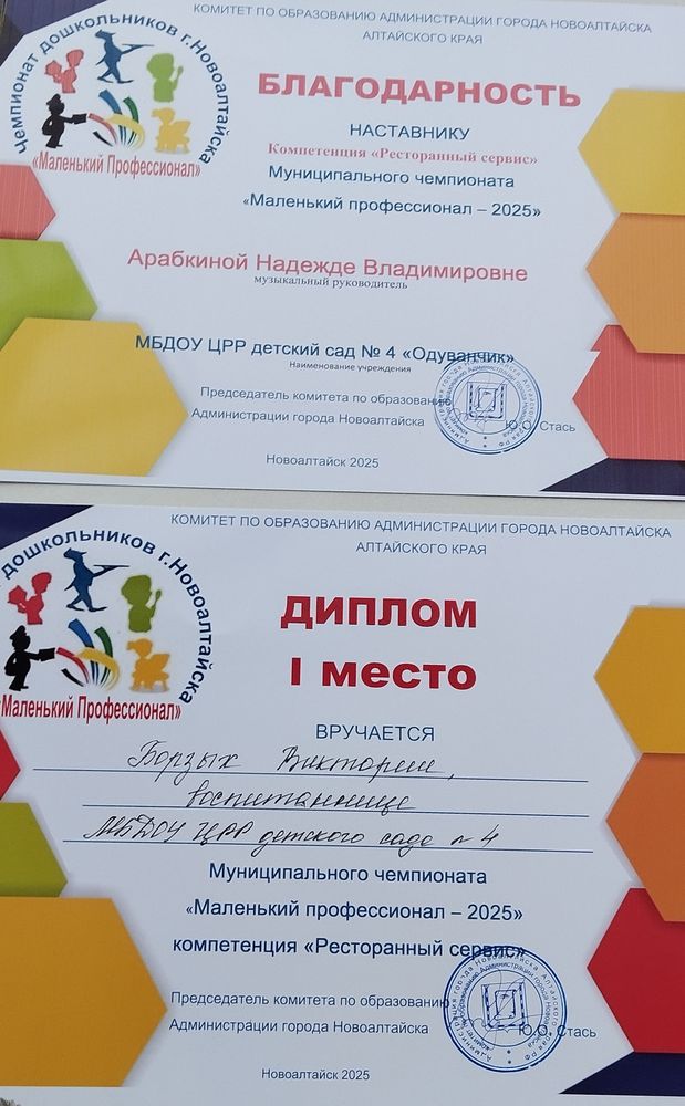 В компетенции «Ресторанный сервис» наш детский сад представила воспитанница подготовительной группы №5 Борзых Виктория (наставник – музыкальный руководитель Арабкина Надежда Владимировна). С непростыми условиями конкурса Вика справилась успешно: рассказала о творческой профессии официанта, выполнила различные задания компетентного жюри, профессионально сервировала стол для романтического ужина, встретила и обслужила приглашённого гостя по всем правилам ресторанного сервиса. Члены жюри по достоинству оценили отличные знания, умения и безупречный внешний вид специалиста ресторанного сервиса Виктории и отдали ей 1 место в данной компетенции. Поздравляем Викторию и желаем ей дальнейших успехов!
