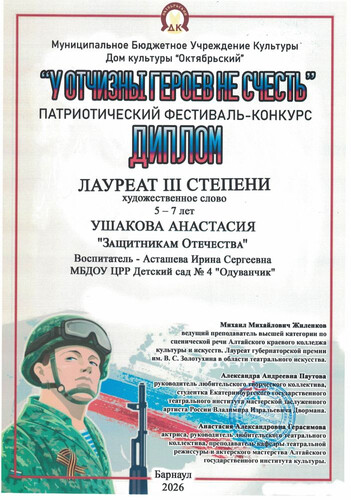 Муниципальное бюджетное дошкольное образовательное учреждение Центр развития ребенка - детский сад №4 "Одуванчик" города Новоалтайска Алтайского края