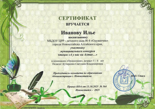 Муниципальное бюджетное дошкольное образовательное учреждение Центр развития ребенка - детский сад №4 "Одуванчик" города Новоалтайска Алтайского края